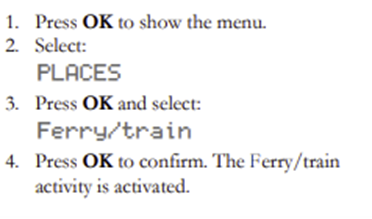 - Once the vehicle is parked, press REST and then activate FERRY/TRAIN (see in the picture below how to activate it).