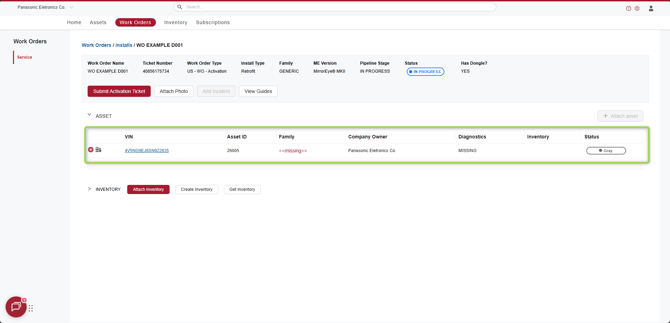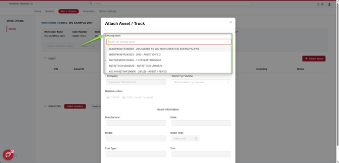 - If the Asset was already created, search by VIN and select in the Existing Asset field.