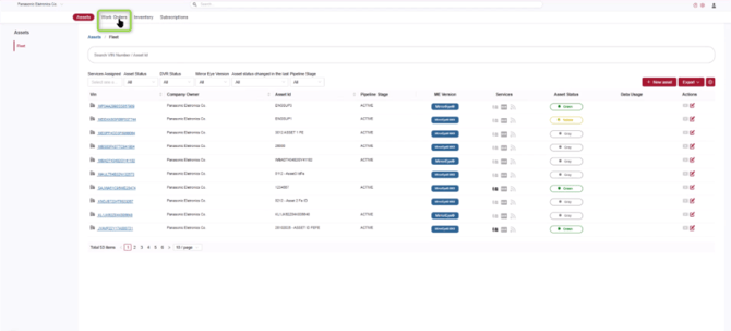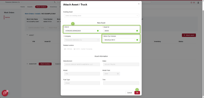 - If not, create by filling in the VIN, Asset number and select the Mirror Eye Version from the drop down (2). Then select the ok button (3).