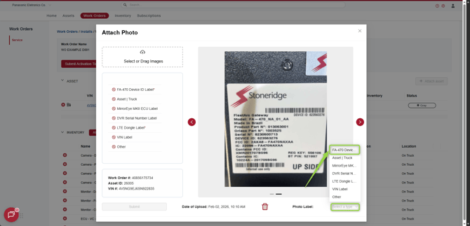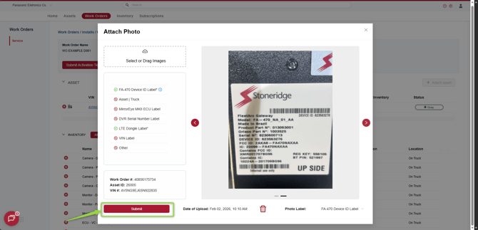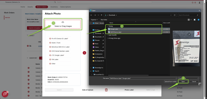 - Using the select or drag images feature (1), select (2) and upload at least the minimum required photos (FA470 and LTE Dongle) (3).