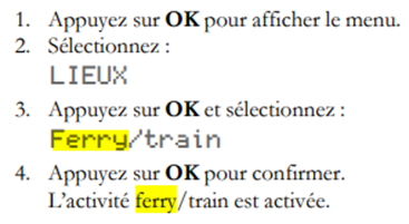 - Une fois que le véhicule est garé, presser REPOS et activer FERRRY/TRAIN (pictogramme ci-dessous pour les détails).